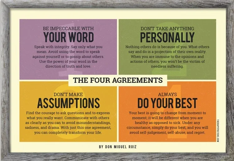 *The Four Agreements: A Practical Guide to Personal Freedom is a popular 1997 self-help book by author Don Miguel Ruiz. Based on ancient Toltec wisdom, the book presents a code of conduct for personal growth, happiness, and inner peace. It has been a New York Times bestseller for over a decade. (source: Google)