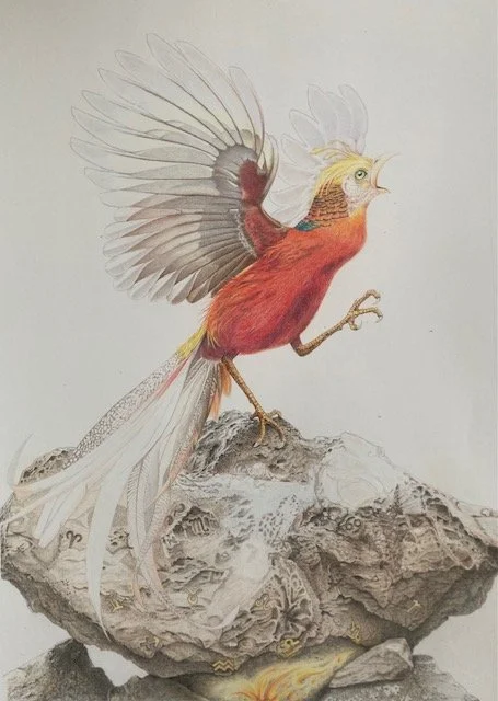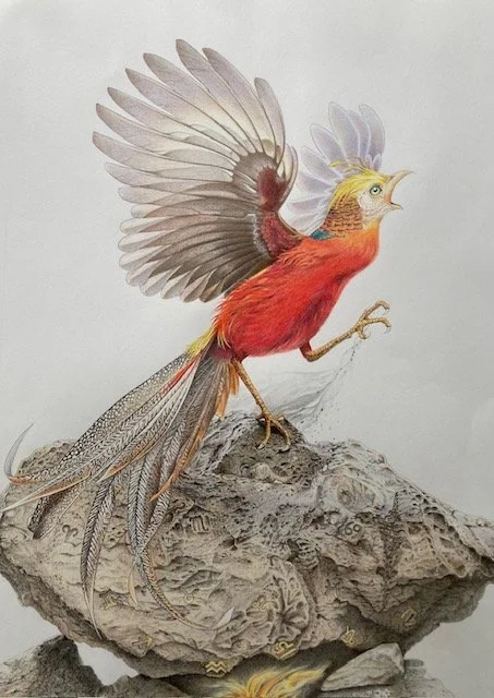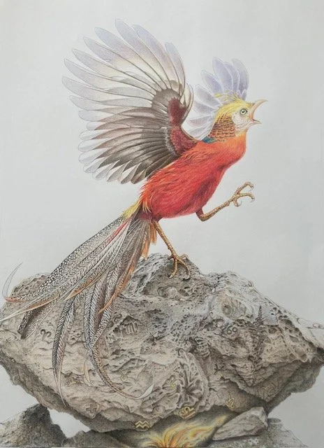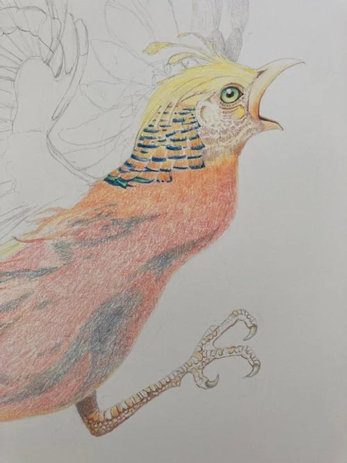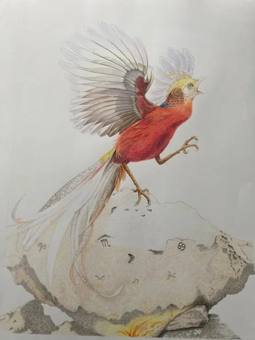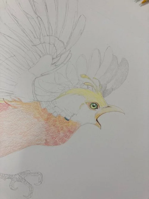 The idea of a phoenix rising from the ashes has been percolating within me for quite some time. Initially, I rejected the idea as a tired cliche, but the concept refused to die. Even before I pulled out my art supplies, I knew I wanted to do things differently. The need to step out of my comfort zone and push for a heavier hand with colour was paramount. Creating textures and shapes I’d never faced before required research. Releasing reference photos to embrace the arena of invention, imagination, and creativity was another hurdle. The final challenge was to go big. Working on 8 ½ x 11 sheets is frowned upon in the art world - or so my instructors had told me - so I dug out an old pad of poster-sized watercolour paper.