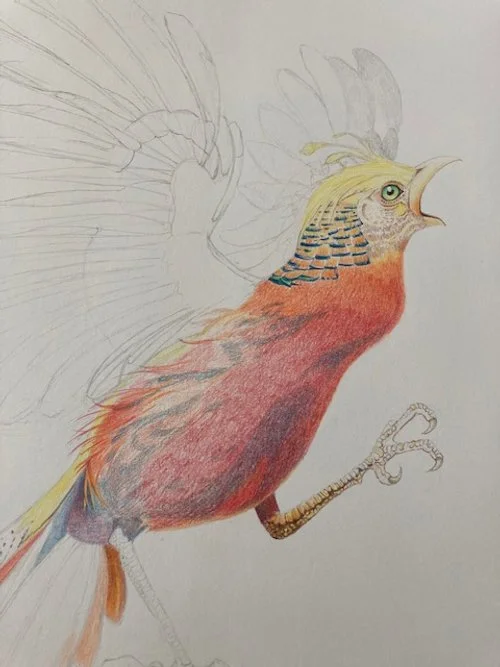 The composition came together quite naturally, but the prospect of adding colour to the drawing stalled the process for several months. Filling such a large space with coloured pencils seemed an impossible task, so the drawing lived under my bed with the dust bunnies until fate stepped in to reignite the project. A random court-side conversation with a fellow artist and badminton player led to this advice, “The river of creativity is always flowing - If you feel stuck, just jump back in. Pick a spot, put down some colour, and see where it leads you.”